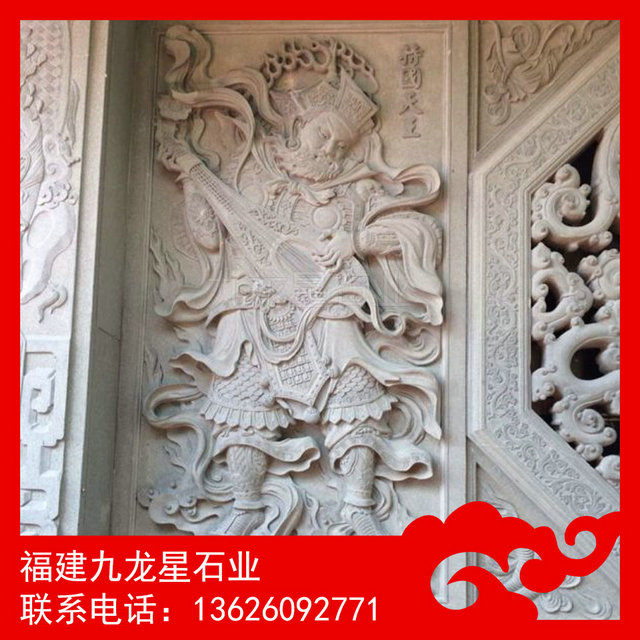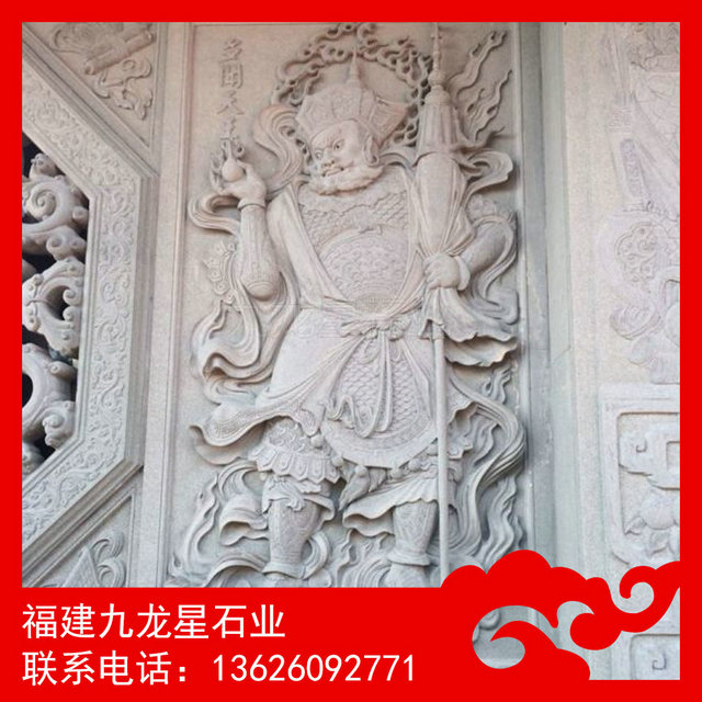 四大天王浮雕 寺廟佛像浮雕——又稱護世四天王,是佛教的護法天神,俗稱“四大金剛”。四大天王為二十諸天中的四位天神,位于第一重天,第一重天又叫四天王天。根據(jù)佛教經(jīng)典,須彌山腹有一山,名犍陀羅山,山有四山頭,各住一山各護一天下(四大部洲,即東勝神洲、南贍部洲、西牛賀洲、北俱蘆洲),故又稱護世四天王 ,是六欲天之第一。他們的神像通常分列在凈土宗禪宗佛寺的第一重殿兩側(cè),因此又稱天王殿。