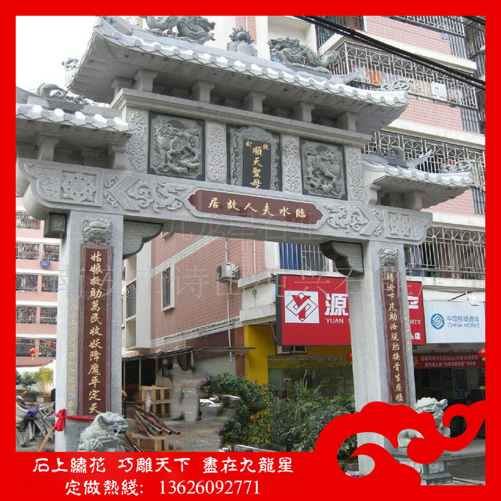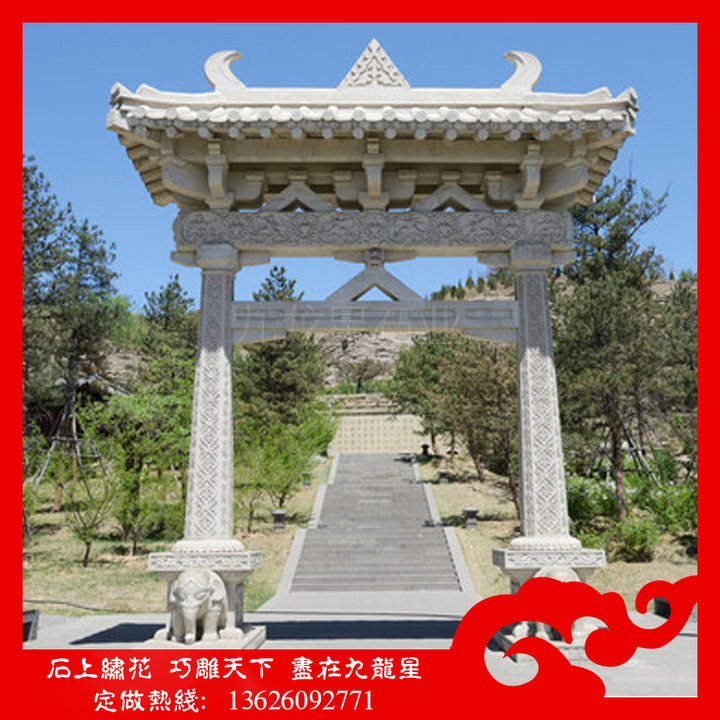 石牌坊的種類很多,單門牌坊也是較常見的類別之一。常見的單門牌坊一般于步行街、村莊、景區(qū)入口較多。石牌坊這種古老建筑在設(shè)計形式上多種多樣,它雖然古老但是設(shè)計形式并不單調(diào),相反這種建筑設(shè)計還為現(xiàn)代設(shè)計提供了很多有益的借鑒。單門石牌坊作為牌坊的一個種類,在很多地方我們都可以見到它的身影,這種建筑相對來說比較簡單,但是可以起到很好的裝飾性作用。