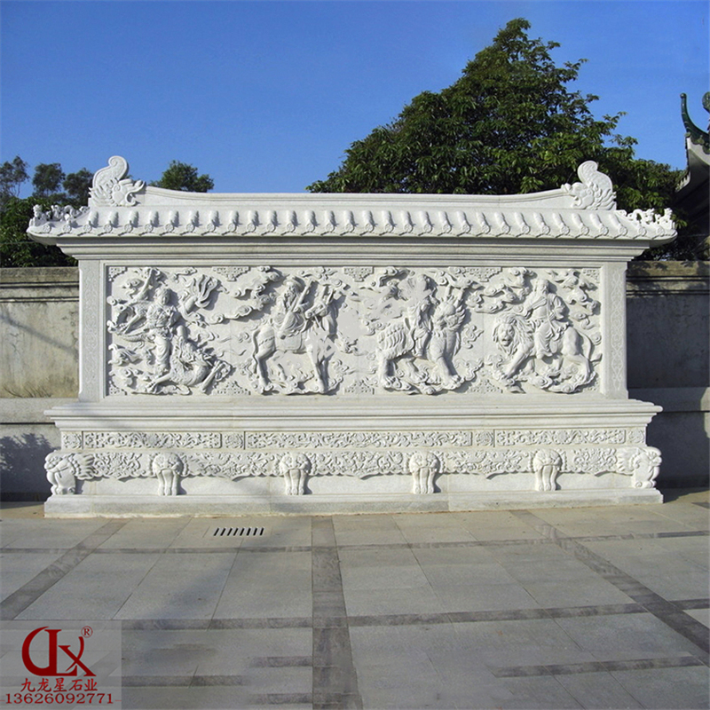 石雕照壁浮雕圖片有一字形、八字形和撇山式等類型。民間雕刻的石照壁,一般用于壁頂、檐口、須彌座、壁心等部位,也用全部都是石材雕刻的。壁心的雕刻主要以兩種構(gòu)圖方式為主:規(guī)范的構(gòu)圖常以線腳或紋樣圍合成長方形的“池子”,分別雕刻四角岔花和中心花;隨意的構(gòu)圖,其形式不拘一格,構(gòu)圖與一般繪畫相仿。照壁上的雕刻題材廣泛,包括福、祿、壽、喜等漢子,以及寓意吉祥的人物、動物、花草等。