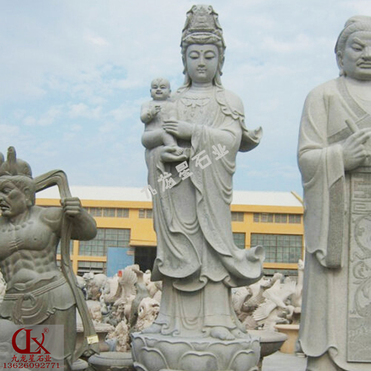 一般來說送子觀音石雕像的形態(tài)便是觀音菩薩在祥云之上,手抱一個小孩,后邊跟著一對金童玉女的形象存在,并且這種石雕廣泛應(yīng)用于寺廟,有的人家里也會擺放一尊,便利家里人能用忠誠的心感動菩薩,然后達(dá)到得“子”這個愿望。