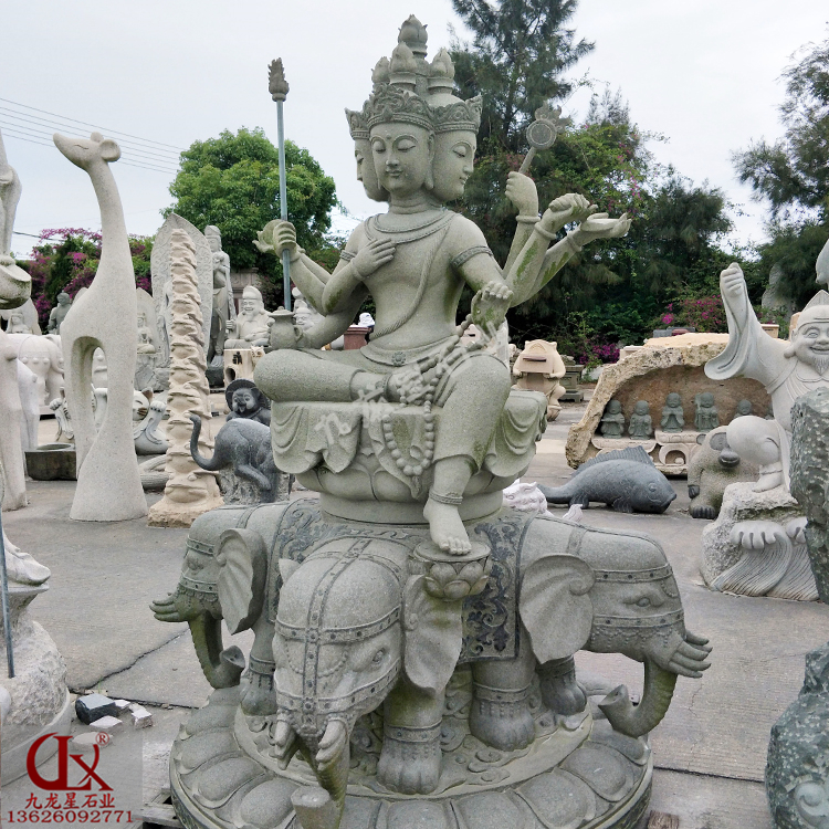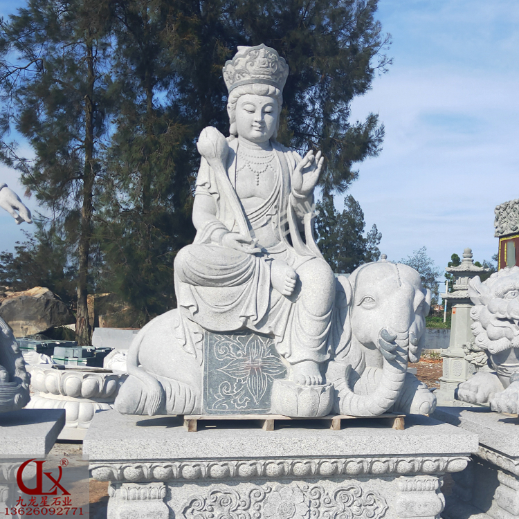 文殊普賢菩薩圣像雕刻一般都是采用天然優(yōu)質(zhì)花崗巖雕刻,石材紋理美觀,雕刻線條流暢,純手工雕刻精美絕倫。普賢菩薩石像造型手持七寶蓮,神態(tài)端莊的坐于六牙白象背上,石雕普賢菩薩與觀世音菩薩,地藏王菩薩、石雕文殊菩薩合稱佛教四大菩薩,象征理德、行德。與釋迦牟尼佛如來、文殊菩薩又尊稱為“華嚴三圣”。