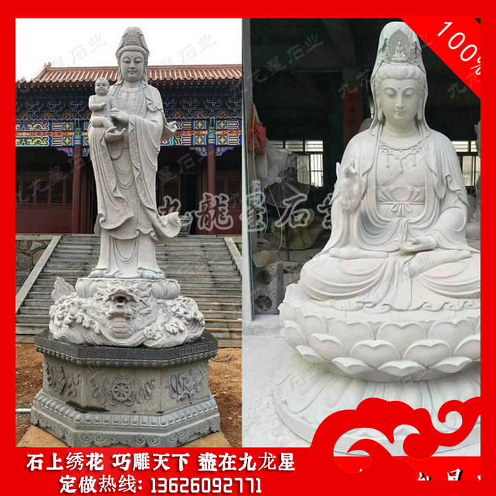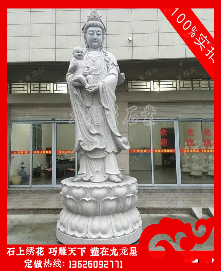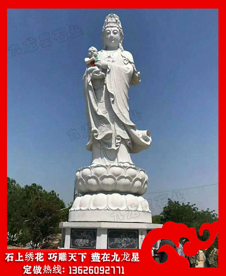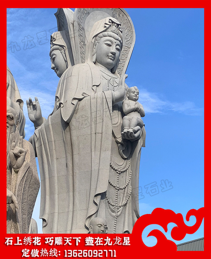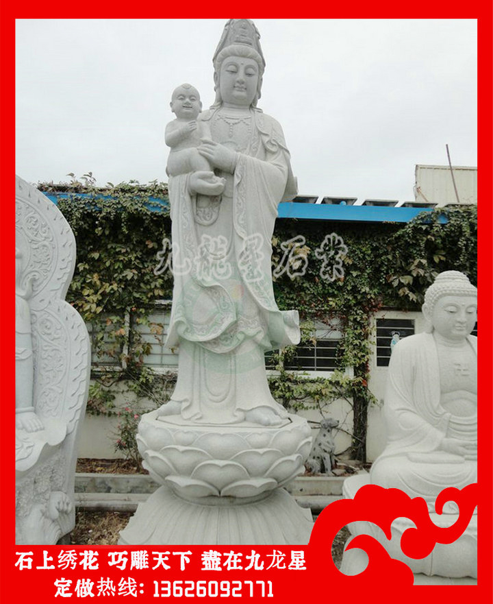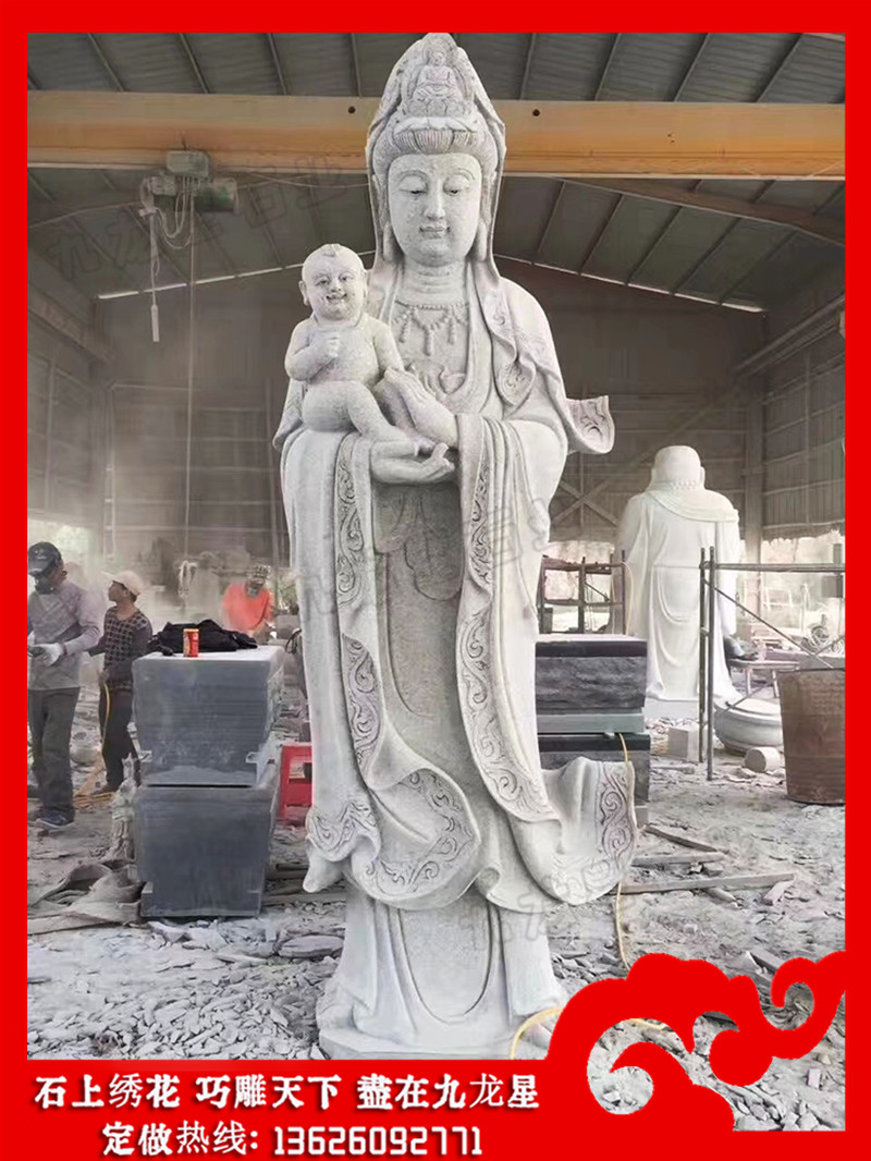 送子觀音石雕像的圖片造型有很多,我們常見的有以下幾種:雙手抱著一個小孩的,這種送子觀音石雕像針對的是膝下無子女的這類人,一般這個小孩看不出是男是女。還有一種就是可以看出來是男的,這種就是滿足膝下無子的一種形態(tài)。雙手各抱一個的送子觀音石雕像,這樣的是一種對多子多福的一種期盼。這樣的形態(tài)就是希望生雙胞胎或者更多的子女的,其實更多子女最好的表現(xiàn)手法是后面還跟著金童玉女,這樣就更好了。