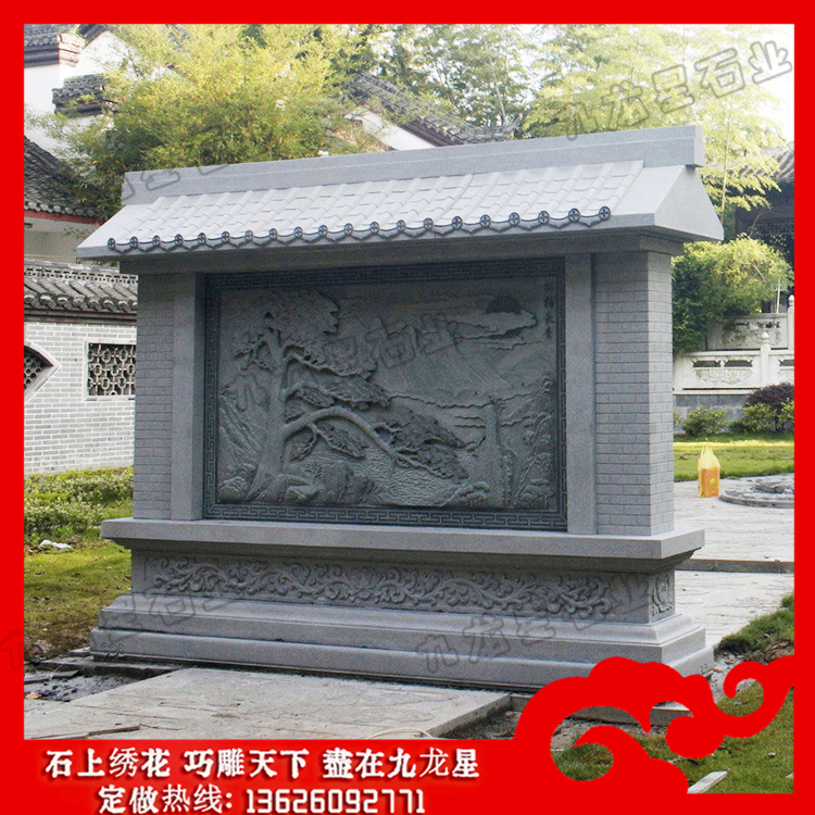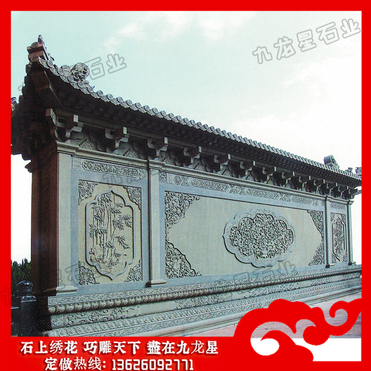 影壁墻也稱照壁,壁身都為正方形,四周用石雕磚雕裝飾,中間的方塊為書法或者繪畫。中式石雕照壁圖案設在大門之內的迎門處,有的是單獨建筑的,有的是鑲在廂房山墻上的。有些家庭,為了裝飾點綴院落,也會在院落一進門處的正對面,修建一個影壁,也即是一堵磚墻。祠堂照壁在正對大門的這一面,一般都有花卉、松竹圖案或者大幅的書法字樣醒目地放置影壁正面。祠堂照壁上書“?!薄ⅰ暗摗?、“壽”等象征吉祥的字樣。