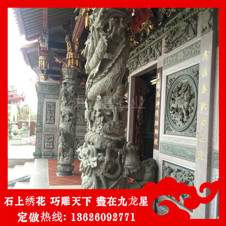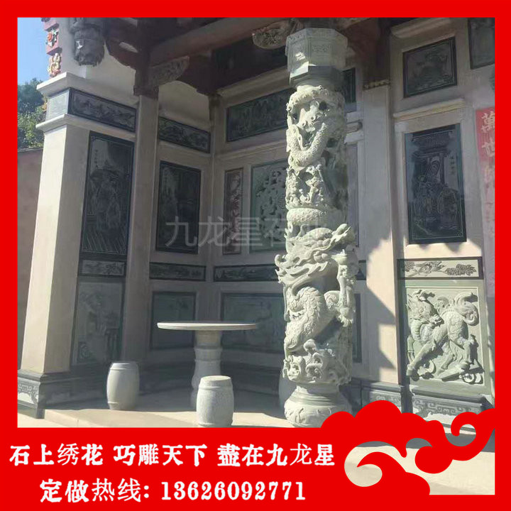 祠堂大門龍柱一般都是成雙成對的出售,寺廟祠堂雙龍柱石雕由于材質的顏色不一,我們將青石雕刻的雙龍柱石雕稱為“青龍柱”,花崗巖雕刻的龍柱稱為“白龍柱”,“青龍柱”自清代以后大量出現(xiàn),因青石“韌”,宜精雕細刻。祠堂大門龍柱若按鏤雕深淺計算,具體可分為蟠龍柱、人物柱、寺廟祠堂雙龍柱、花幕柱、八仙柱等。