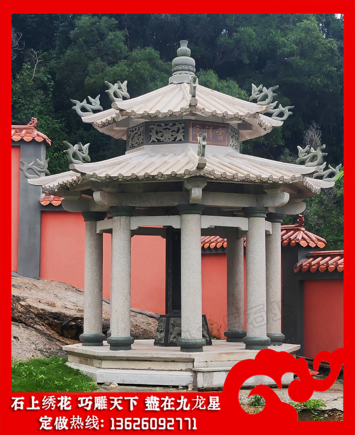 雙層石頭涼亭可以作為避雨,休息,乘涼等用處。古建雙層六角涼亭石雕一般材質(zhì)為天青石或者花崗巖。雙層石頭涼亭樣式的建筑風(fēng)格各不相同,有中國(guó)復(fù)古風(fēng)格,現(xiàn)代風(fēng)格,西方風(fēng)格等。風(fēng)格主要體現(xiàn)在棚頂?shù)慕ㄖL(fēng)格,以及四周的柱子上。柱子上可以直接使用整塊的石頭,也可以在石頭上做上浮雕雕刻。