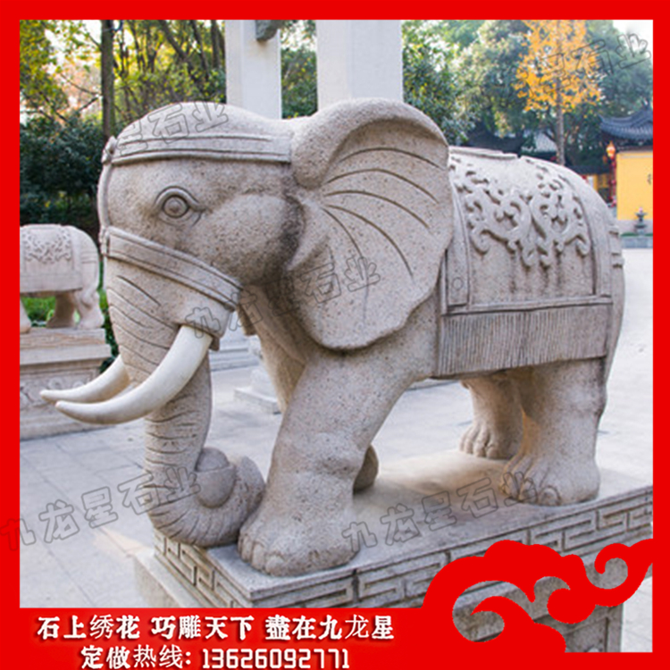 寺院石雕大象加工制作的造型一般為六牙象,身上雕刻具有寺院或佛教代表寓意的圖案,做工精細,六牙整齊,擺放在山門前面或是寺院大殿入口處,可以很好地裝飾門面。石頭制品擺放在室外可持續(xù)成百上千年之久,就算建筑物不斷重修,石雕大象依然可以屹立不倒。文革時期古剎寺廟被毀,zui終能尋回遺跡并還原原貌靠的就是門口的石雕大象擺件或者其他石雕。