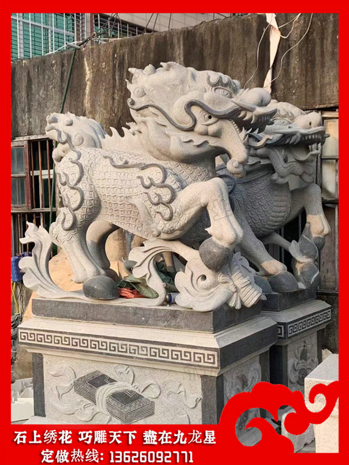 麒麟石雕(大門口石雕麒麟圖片 青石石雕麒麟擺放寓意)——九龍星石業(yè)。