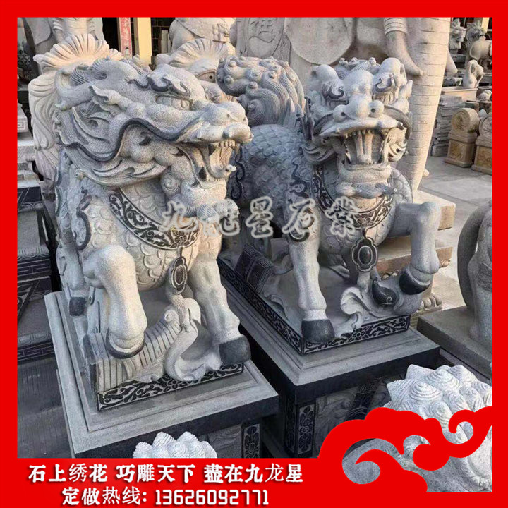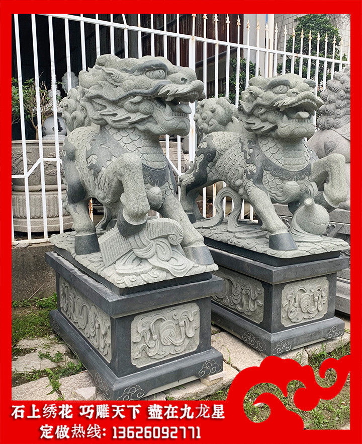 大門口石雕麒麟,中國(guó)傳統(tǒng)祥獸,神話傳說(shuō)是龍牛雜交品,是中國(guó)古籍中記載的一種神物,與鳳、龜、龍共稱為“四靈”,是神的坐騎,古人把麒麟當(dāng)作仁寵,雄性稱麒,雌性稱麟。麒麟與貔貅的區(qū)別:石雕麒麟是吉祥神寵,主太平、長(zhǎng)壽。民間有麒麟送子之說(shuō),麒麟是龍頭,麝鹿身,尾似龍尾狀,龍鱗。它的綜合面不及龍、鳳那么廣泛,不過(guò)名氣也不算小。