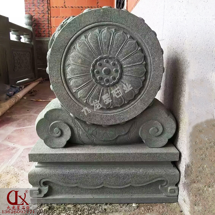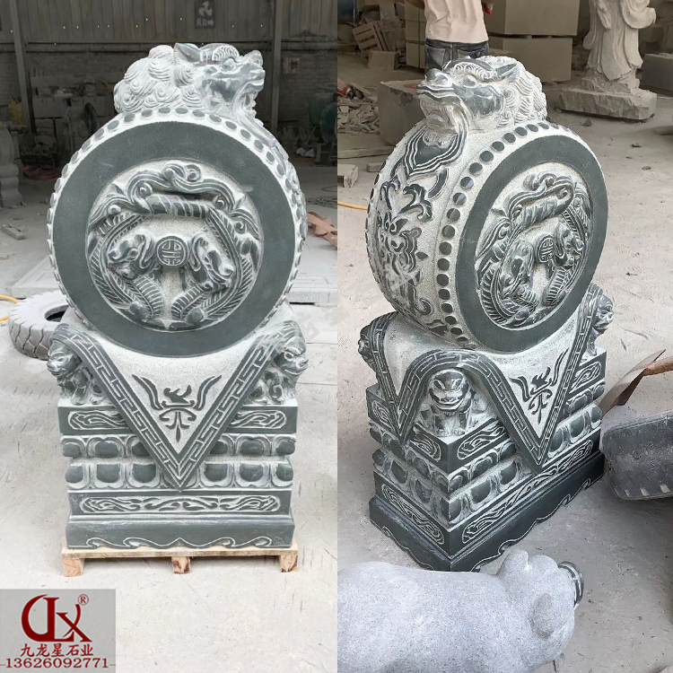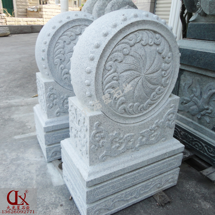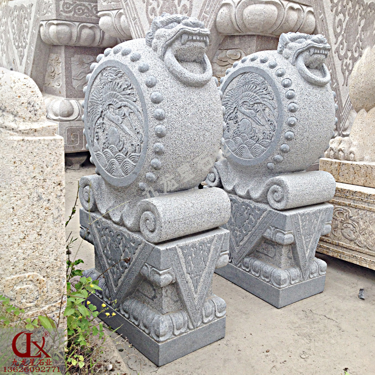 仿古抱鼓石是民居宅門構(gòu)件的功用產(chǎn)品,它是依托功用施以裝修的石制構(gòu)件,起著圍護大門壯主人威勢以撐門面的作用。中國的外墻宅門一般為兩扇,而內(nèi)室門戶為一扇,因為漢字門是由兩戶所組成的,兩扇門決議了抱鼓石必定是對稱的結(jié)構(gòu)。