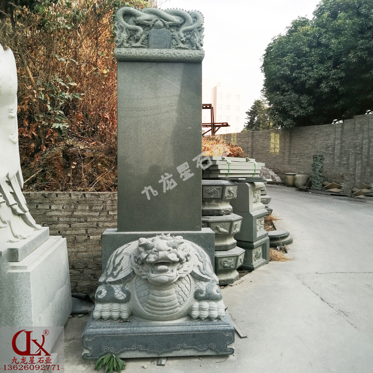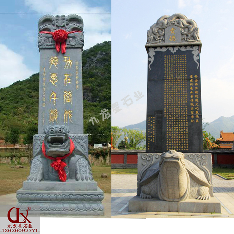 龍頭龜馱碑圖片分為兩個(gè)部分,底下的龍龜部分磨合上面碑銘部分,其中底下的龍龜部分選用青石加工而成,而龍頭龜馱碑上面的石碑選用的是芝麻白石材加工而成,兩種顏色各異的著作結(jié)合形成了十分特別的既視感。