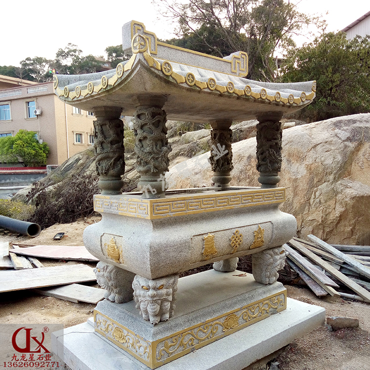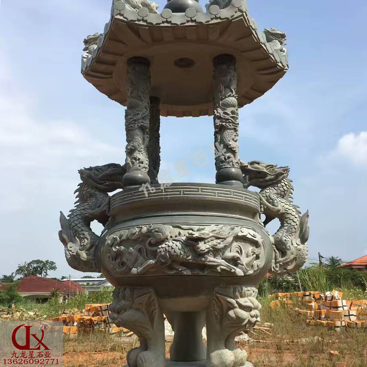 石雕香爐現(xiàn)貨其用途亦有多種,主要是用于敬神供佛,祭祀祖宗,也有用于陳設(shè)。形狀上常見為方形或圓形,方形的香爐一般有四足;圓形的香爐,都有三足,一足在前,兩足在后放置??讨煌幕y和文字,表示用途各別不同。有的香爐上雕刻著龍的浮雕,龍的象征寓意如下,飽滿寬闊的前額表示聰明智慧;鹿角表示社稷和長壽;牛耳寓意名列魁首:虎眼表示威嚴(yán);鷹爪表示勇猛;獅鼻象征富貴;金魚尾象征靈活;腿上火焰象征辟邪。