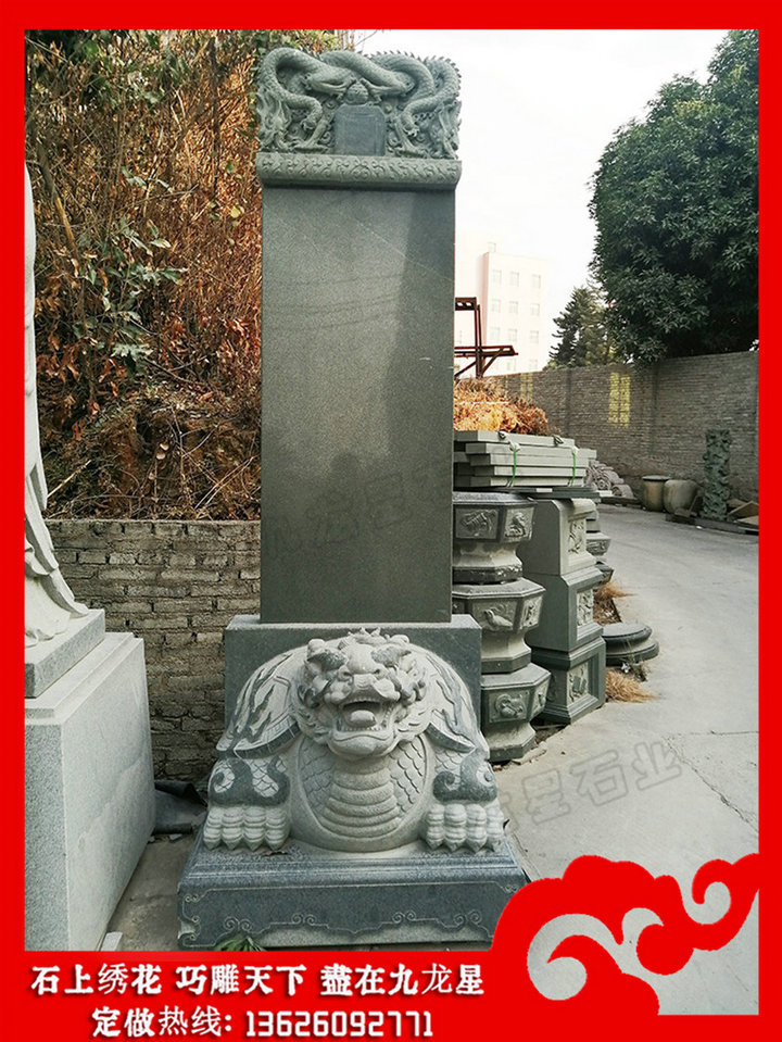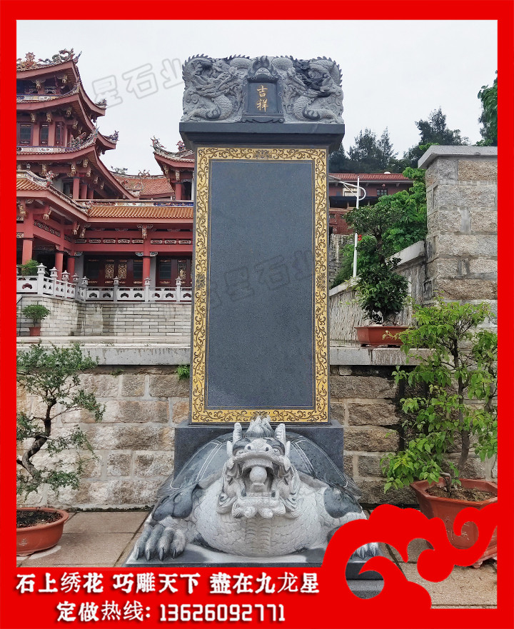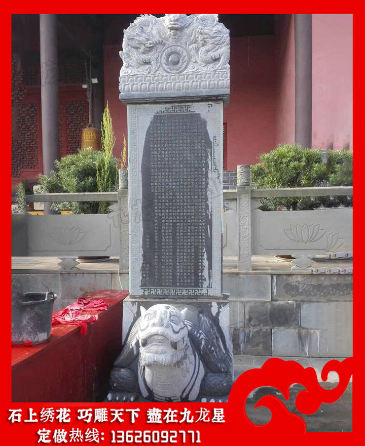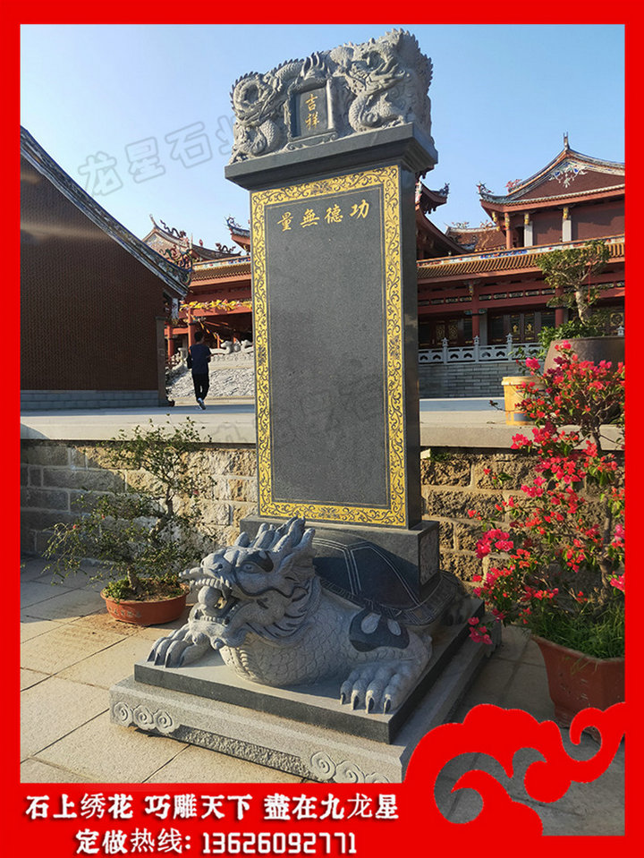 功德碑、龜駝碑、石碑、龍頭碑、龍紋石碑文化源遠(yuǎn)流長、博大精深,具有很高的藝術(shù)價值、史料價值、書法價值,而龍紋的演變又與佛教、道教有著千絲萬縷的關(guān)系,這些便組成了富有特色、燦爛持久的碑石文化,并在中華文明的締造中具有不容忽視的重要意義。石雕神龜馱碑,學(xué)名為龜趺,意為“龜形的碑下石座”,多數(shù)都雕成昂首的巨龜形狀,唐《西陽雜俎》一書中稱龜馱碑圖片為“龜?shù)裨拏髡f中龜力大能負(fù)重,因此古人把碑座制成龜?shù)臉幼印F鋵?,歸根結(jié)底,馱碑龜?shù)某霈F(xiàn),源于古人對龜?shù)某绨荨?/span>