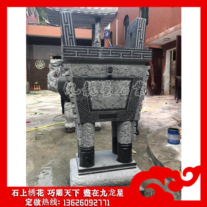 寺廟外用香爐石雕的種類繁多,不同形狀的寺廟香爐鼎,供在不同的位置、焚燒不同的香。天圓地方,這是古代人對(duì)宇宙看法,傳統(tǒng)風(fēng)水學(xué),亦套用了這一種看法。自古代以來,歷代帝皇向天祭祀時(shí)所用的爐,都是石雕制造。