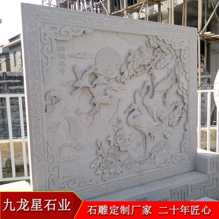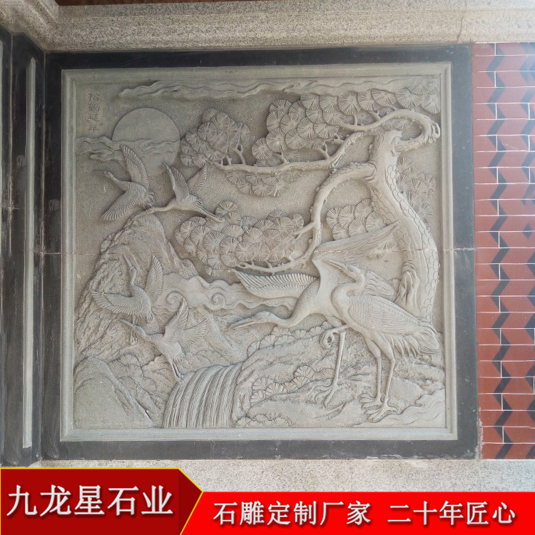 松鶴延年浮雕壁畫是一種吉祥意義的圖案款式,常見于寺院宗祠使用。當(dāng)然,不同的場(chǎng)合所雕刻的松鶴延年浮雕圖案也會(huì)有所區(qū)別。石材浮雕松鶴延年。