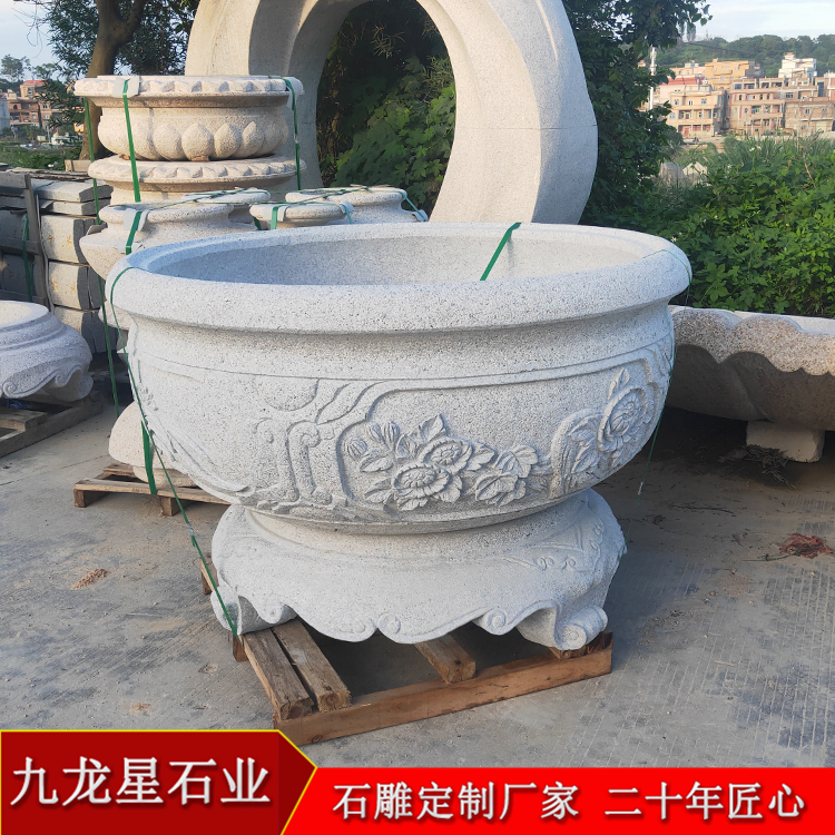 花崗巖成品花以其雕刻精美性、表現(xiàn)細(xì)節(jié)的細(xì)膩性、大氣美觀的造型、以及能長(zhǎng)久地在室內(nèi)戶外場(chǎng)所使用的特點(diǎn),受到很多園林景觀設(shè)計(jì)師的青睞。因此大口徑石盆定制被大量運(yùn)用在城市或園林景觀建設(shè)當(dāng)中,成為人們常見的花草栽種器具。