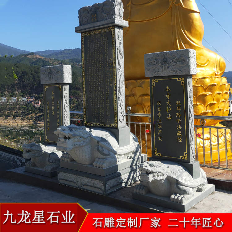 寺廟石雕馱碑神龜是很常見的。青石馱碑龜在民間常被‘王八馱石碑’。 一般是用青石雕刻而成。傳說有辟邪鎮(zhèn)宅、永世不倒、擋水擋災(zāi)等作用。百姓通常認 為它有吉祥的寓意,不僅能看護寺院還能穩(wěn)固一方水土。